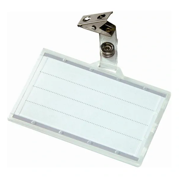 Transparentní identifikátor z pevného plastu. Úchyt - otočný krokodýlek.