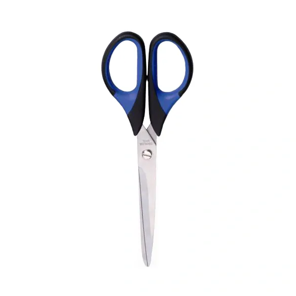 Kovové nůžky s plastovým úchopem, symetrický tvar.